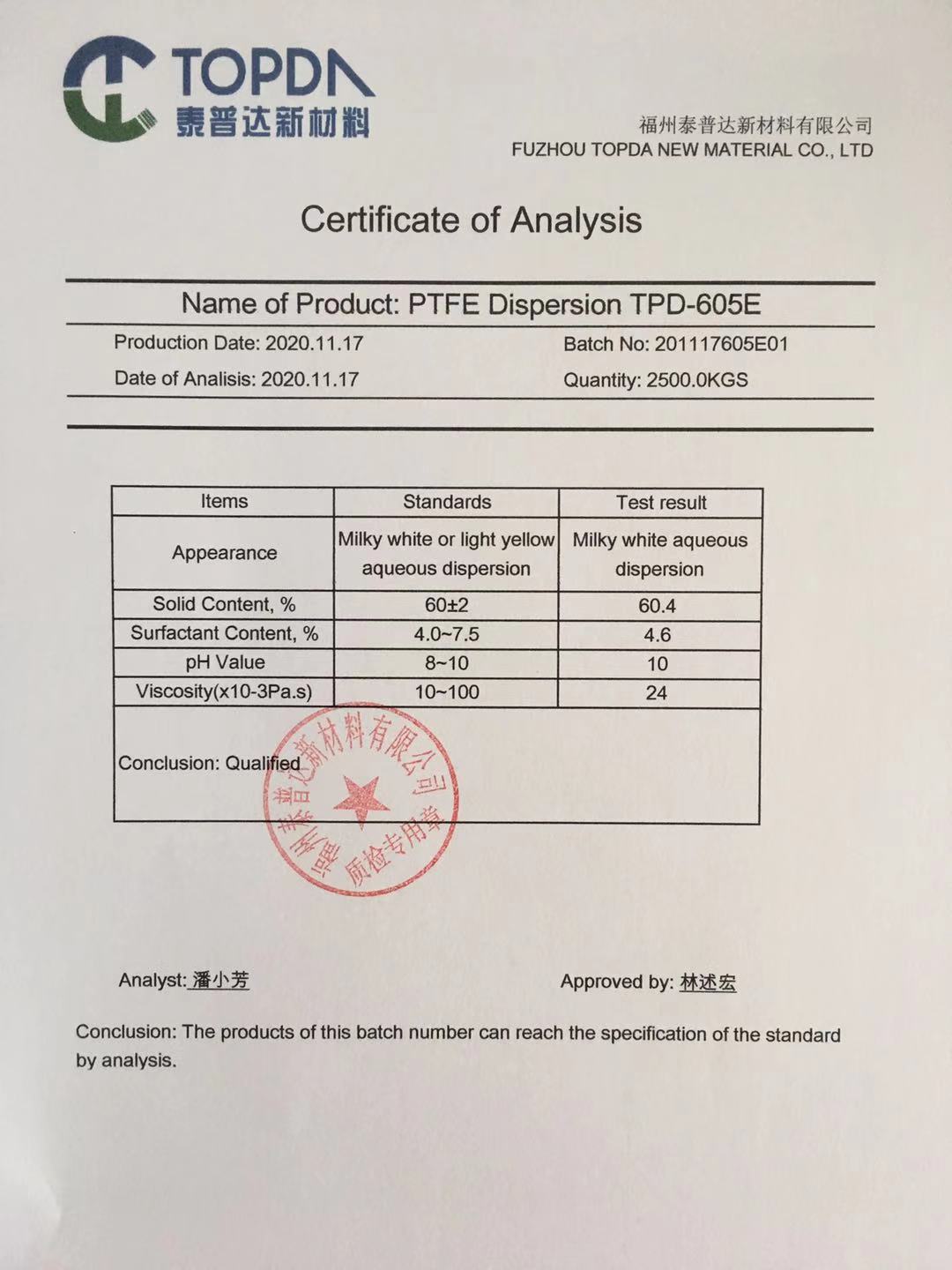 PTFE Dispersion TPD-600E Grades are aqueous milky dispersions of very small PTFE particles in water, stabilized by surfactants. They are widely used in various application fields such as impregnation of glass fiber and asbestos, non-stick coating for cooking ware, etc.